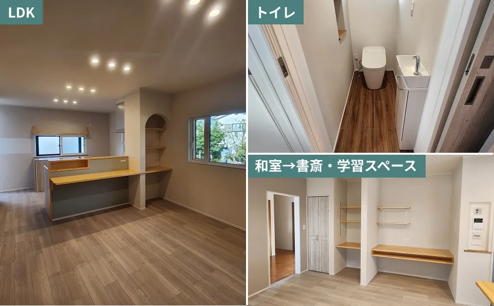 和室を洋室へリフォームして対面キッチンのある広々としたLDKに変更し、その一角にはお子様の学習やパソコン作業に便利な書斎スペースを新設しました 。あわせて、広すぎたトイレや洗面室をコンパクトに見直すことで生まれたスペースをファミリークロークとして有効活用し、収納力を高めると同時にスムーズな家事動線を叶えました 。